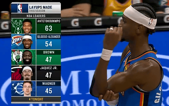 比赛的第三节,转播画面给出一组数据,内容为本赛季至今球员上篮得分次数的榜单,详情如下: