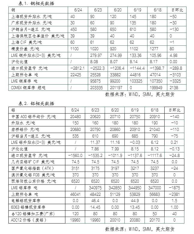铝现货市场方面,盘面小幅回落,市场询盘增加,但实际成交仍然围绕长单,现货市场较为清淡。6月24日,SMM A00铝报20540元/吨,较上一交易日跌110元/吨,对07合约升水150元/吨,较上一交易日跌10元/吨。