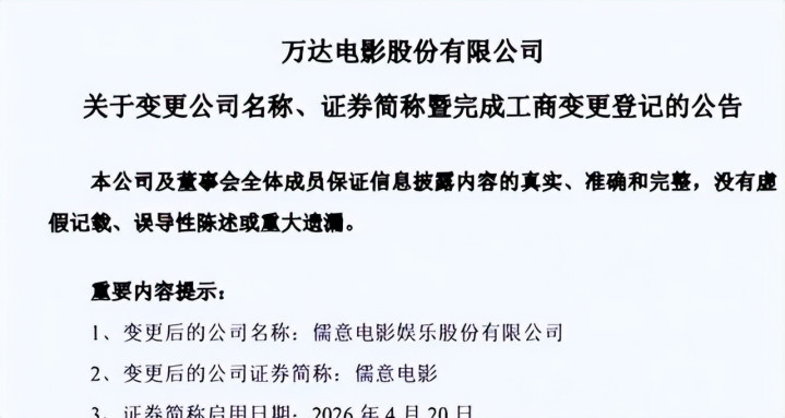 2026年4月19日晚间,万达电影公告称,公司已完成工商变更登记手续,并取得换发的营业执照,公司名称由"万达电影股份有限公司"变更为"儒意电影娱乐股份有限公司",证券简称由"万达电影"变更为"儒意电影",证券代码"002739"保持不变。