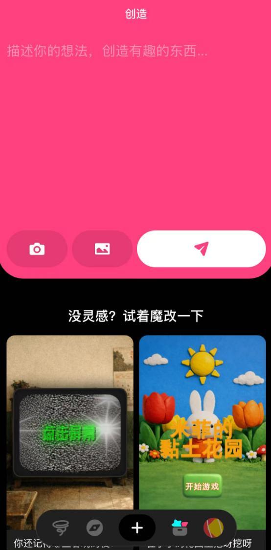 点击页面下方的“+”号进入创作页面,想做一个什么样的交互内容,直接打字就行,也可以拍照或者上传图片作为参考。